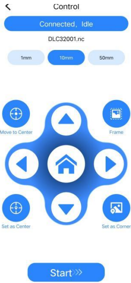 Step 8: Go to the Control page, tap the Frame button to test the suitable area for engraving, and then tap Start.